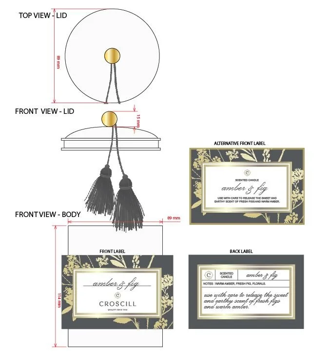Candle. (Ceramic container with printed metallic label and tassel detail.)
